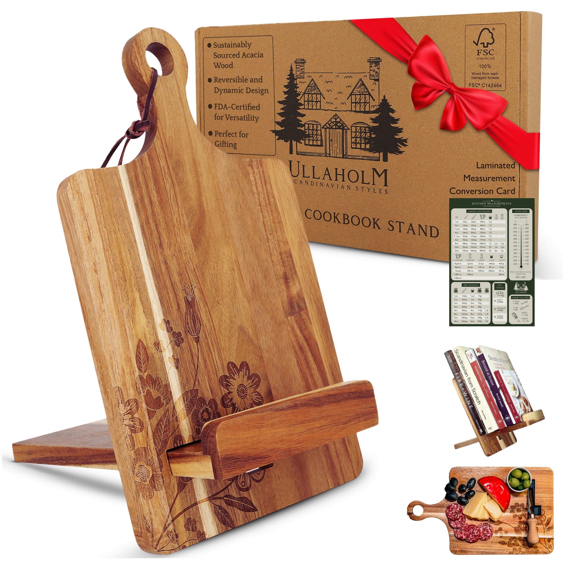 - This Stand Wears Many Hats: This wooden cookbook holder stand props up your recipes in that sauce-stained cookbook or on a tablet; It's also a great serving board for cheese and charcuterie, and even moonlights as a cutting board